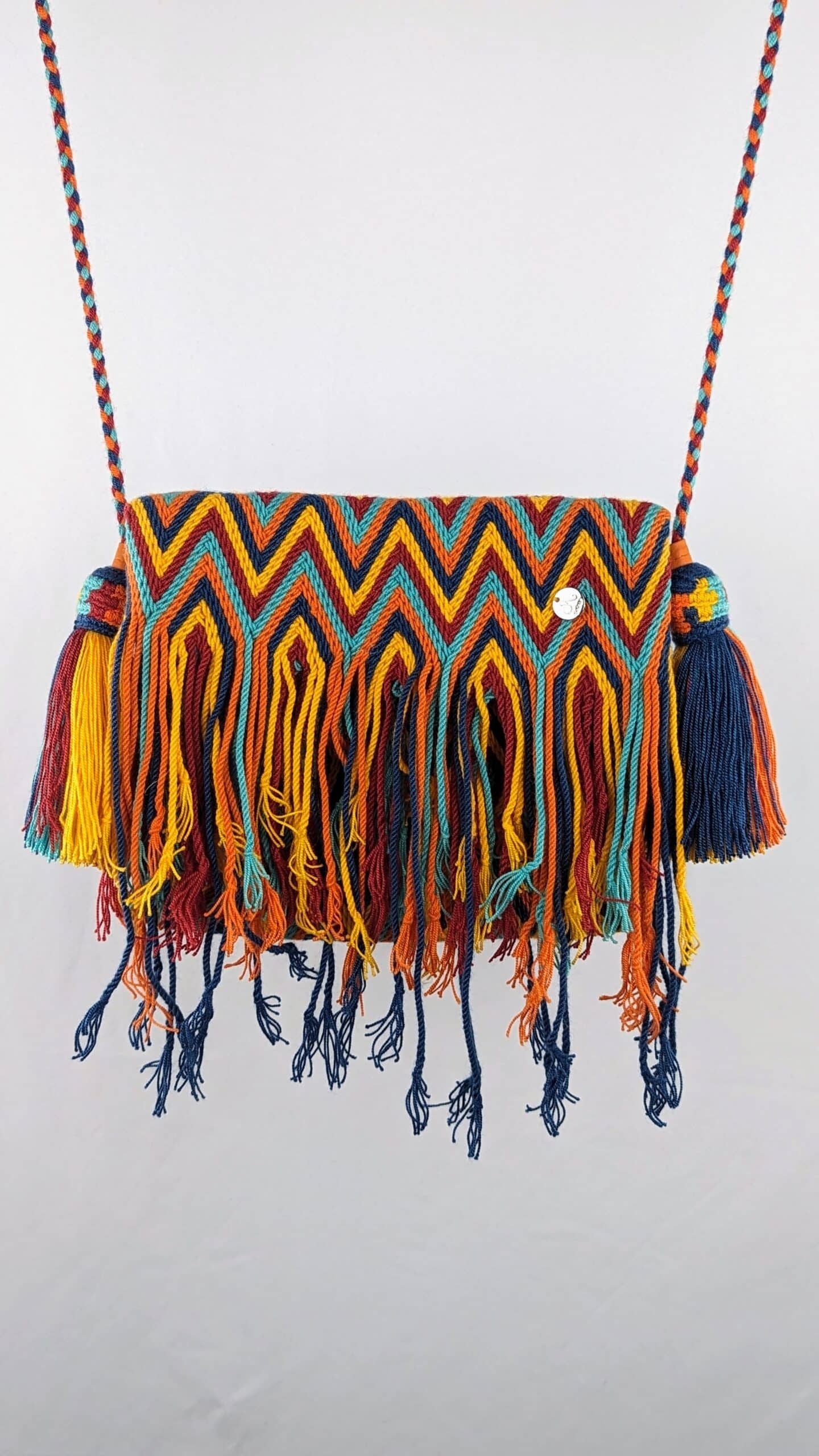 Questa simpatica pochette a tracolla? ci invita a portare le noste cose esensiali. Questa borsa ? stata lavorata a mano all’uncinetto dagli artigiani Wayuu della Colombia e rifinita con una cerniera e un pompon.