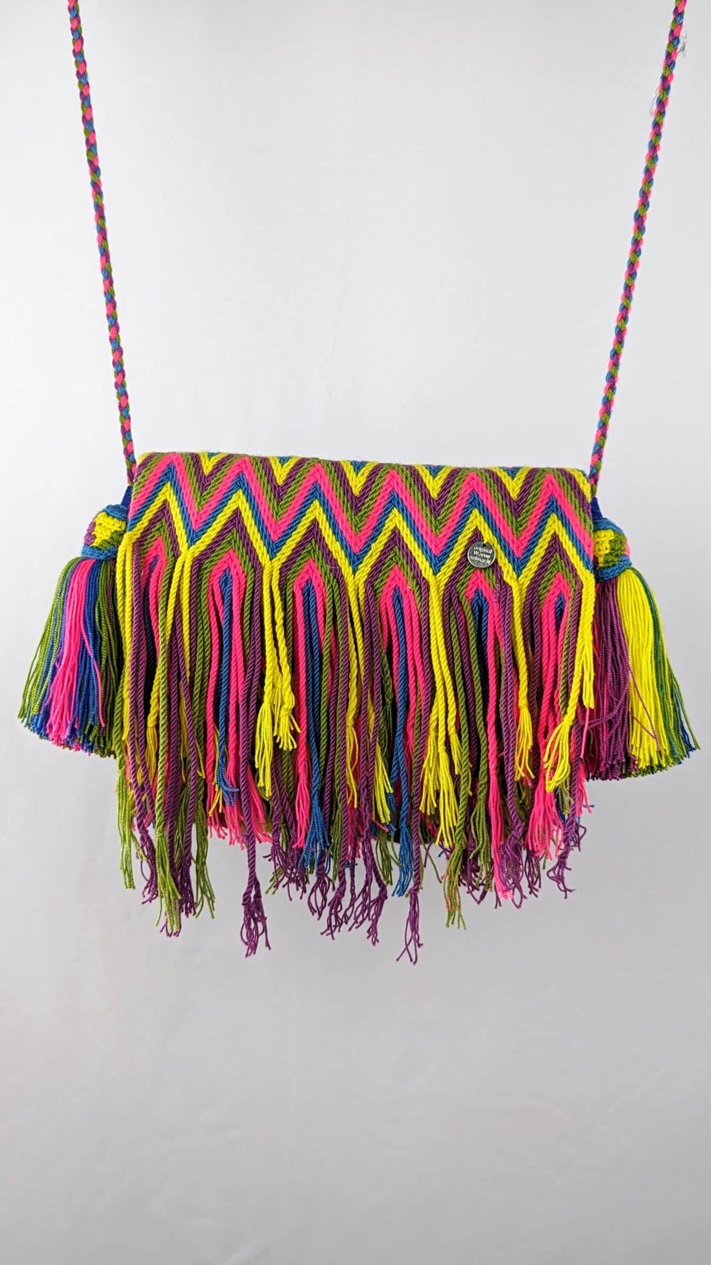 Questa simpatica pochette a tracolla? ci invita a portare le noste cose esensiali. Questa borsa ? stata lavorata a mano all’uncinetto dagli artigiani Wayuu della Colombia e rifinita con una cerniera e un pompon.
