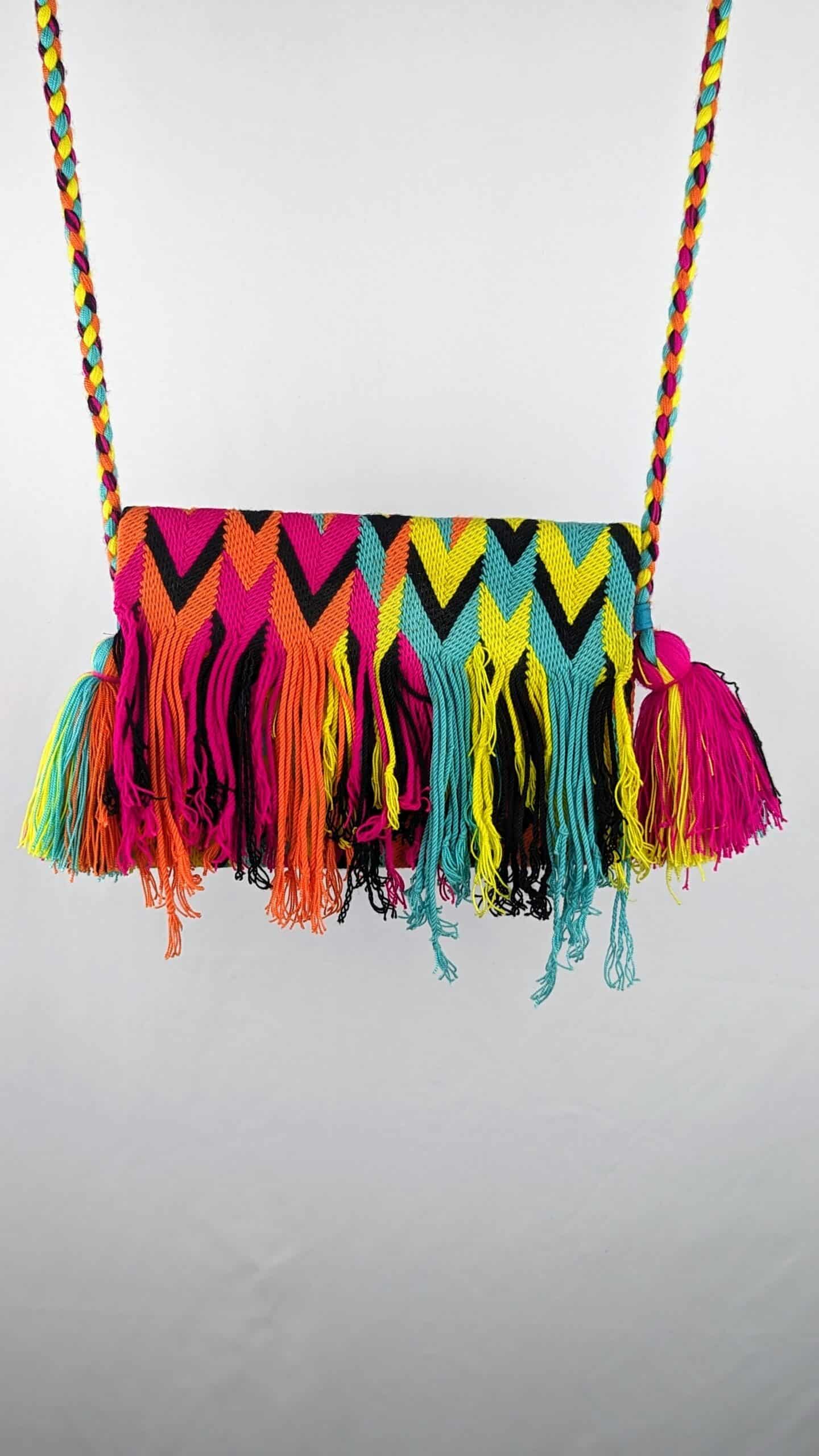 Questa simpatica pochette a tracolla? ci invita a portare le noste cose esensiali. Questa borsa ? stata lavorata a mano all’uncinetto dagli artigiani Wayuu della Colombia e rifinita con una cerniera e un pompon.