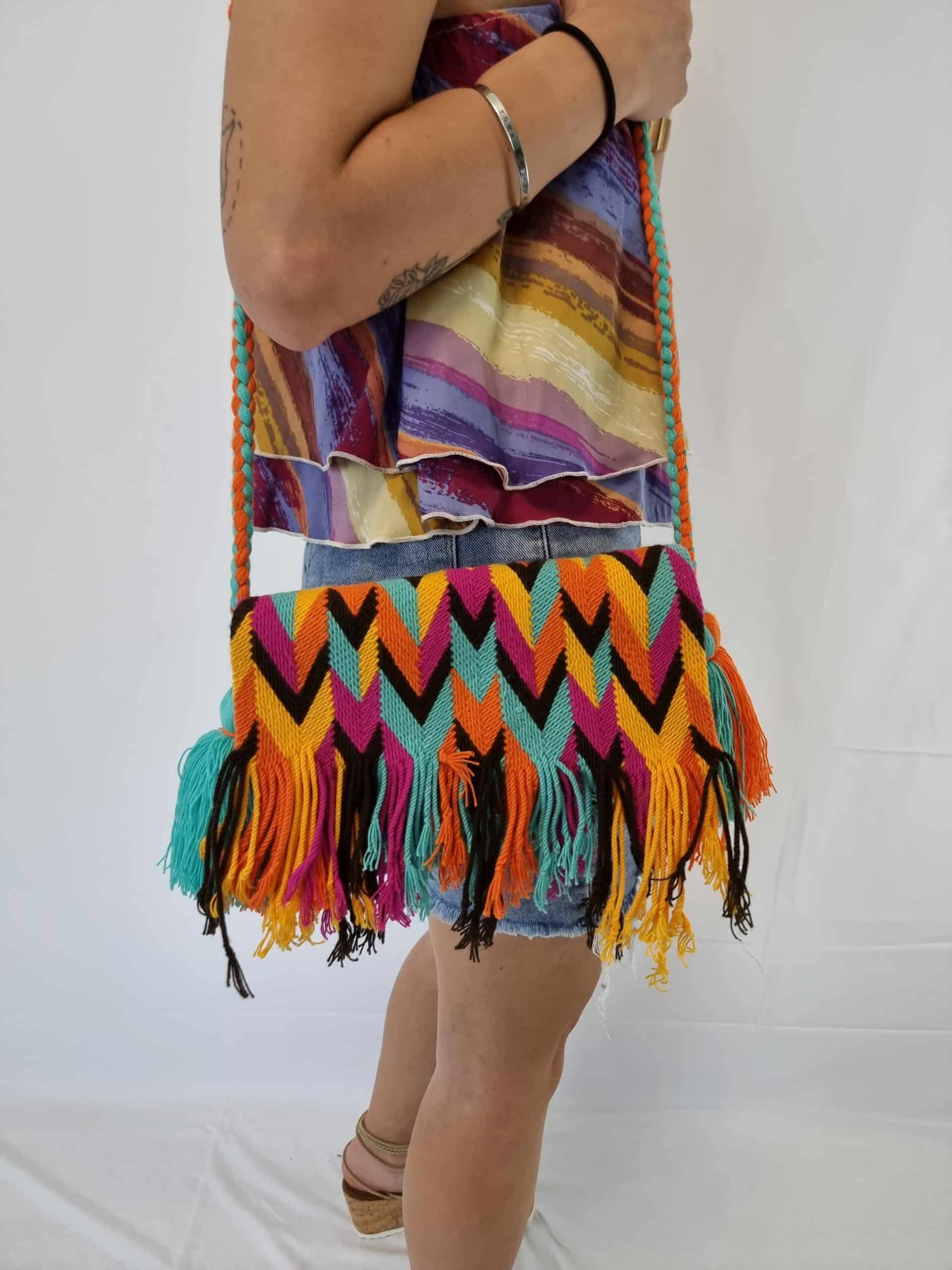 Borsa a pochette? a tracolla elaborata interamente a mano, con la tecnica ancestrale della trib? colombiana.? Con un design innovativo e contemporaneo,