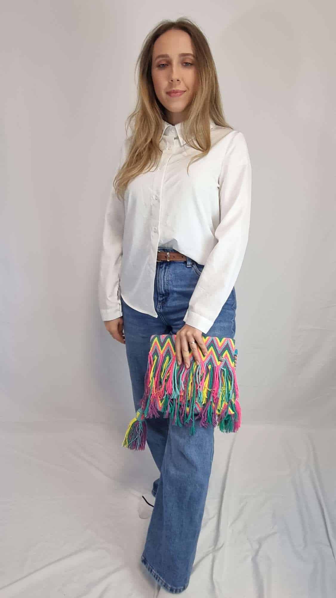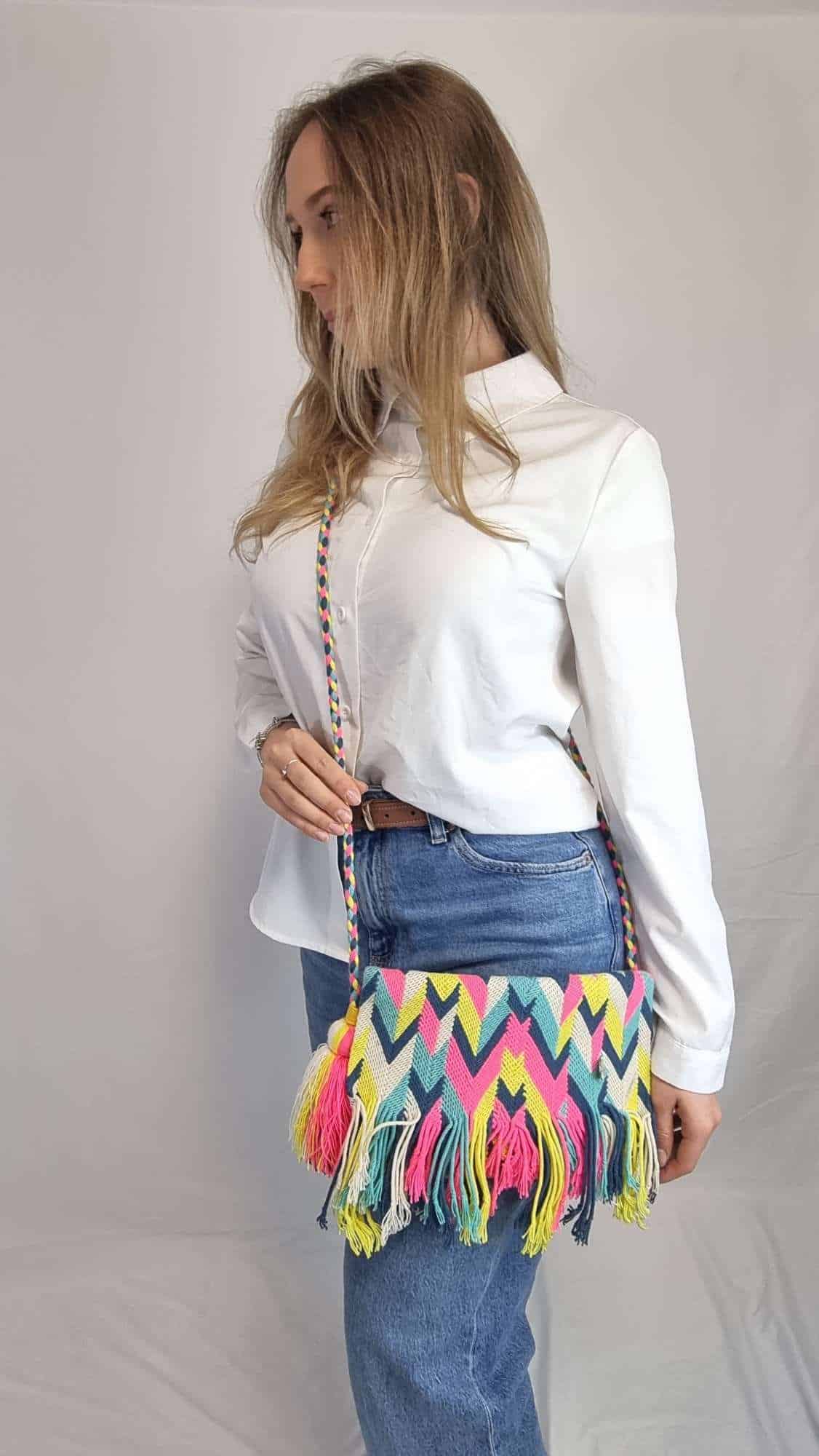 Borsa a pochette a tracolla elaborata interamente a mano, con la tecnica ancestrale della tribu colombiana. Con un design innovativo e contemporaneo,